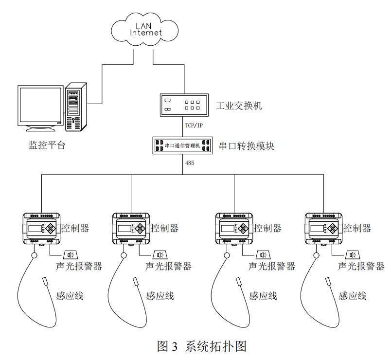 控制器與感應(yīng)線連接,感應(yīng)線安裝于漏液檢測區(qū)域,當(dāng)發(fā)生液體泄漏時,觸發(fā)控制器報警及繼電器動作,通過 RS485 信號上傳泄漏數(shù)據(jù)至監(jiān)控平臺,精準(zhǔn)定位,實現(xiàn)實時集中監(jiān)控。控制器繼電器輸出信號可聯(lián)動控制外圍設(shè)備如聲光報警器、自動閥門與智能報警等設(shè)備。